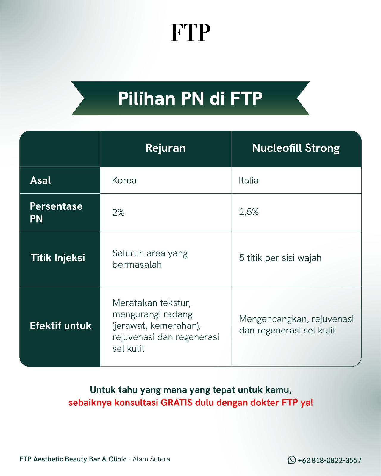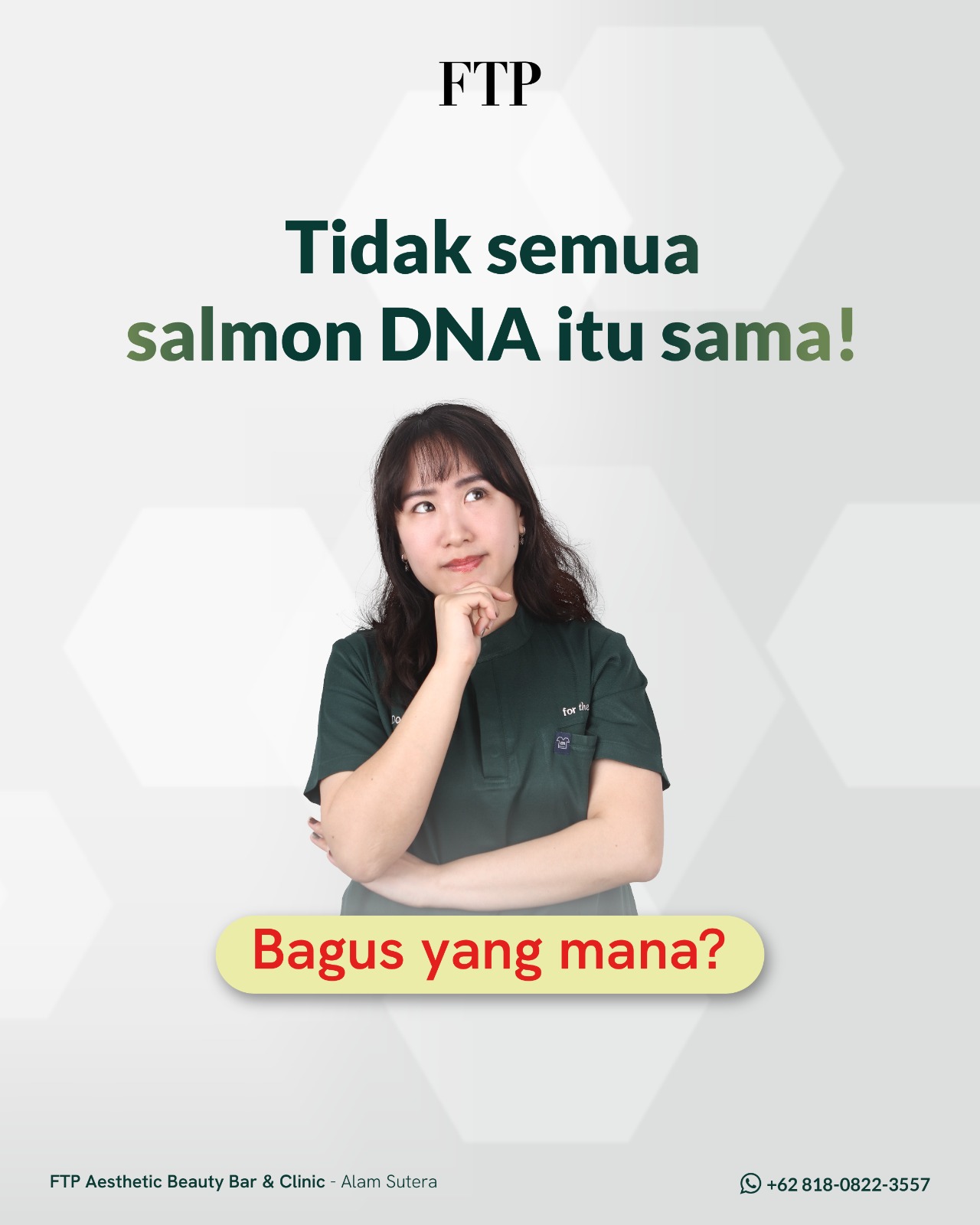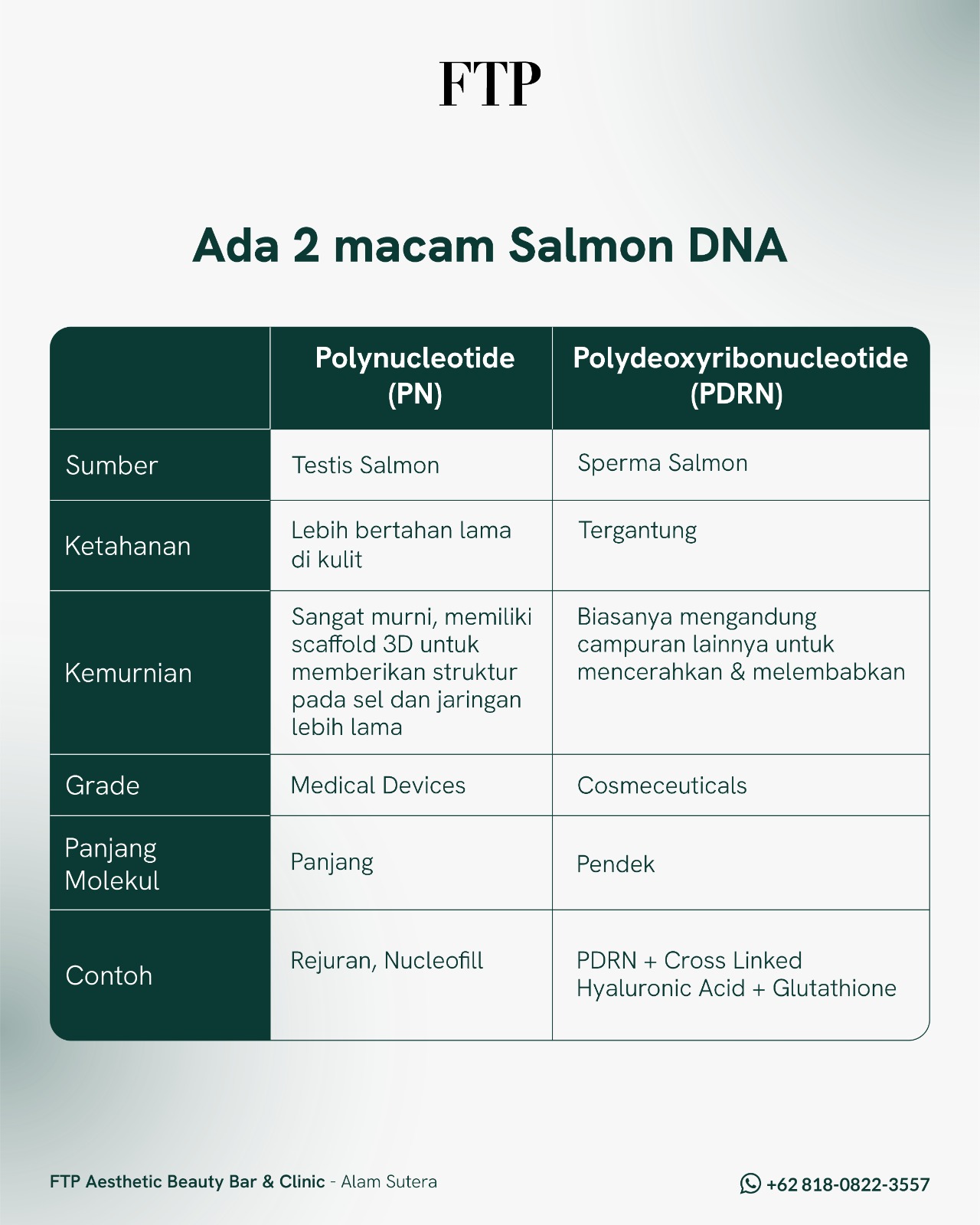 Salmon DNA PDRN di FTP selain mengandung PDRN, juga mengandung glutathione (antioxidant yang poten) dan cross linked hyaluronic acid yang sangat baik untuk menghilangkan kemerahan di wajah, terutama untuk wajah yang memiliki kulit sensitif, melembapkan dan meremajakan kulit.